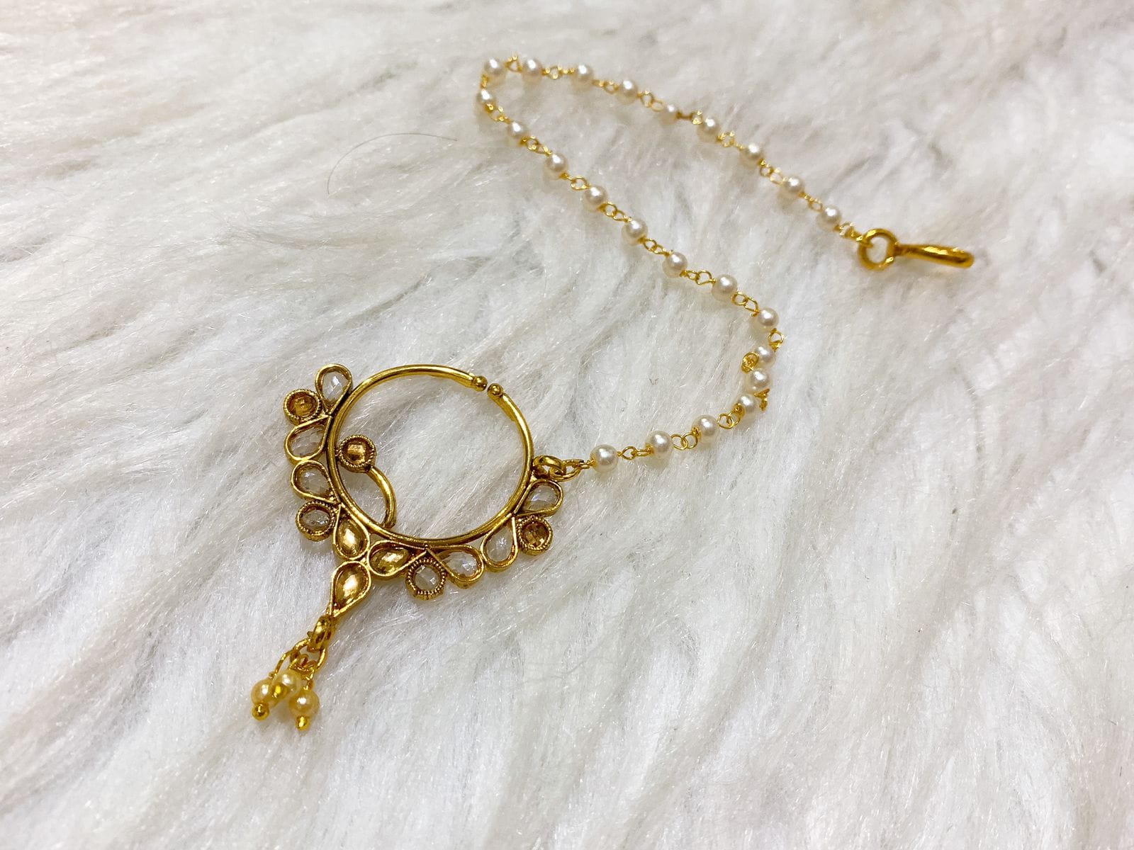 Expertly crafted with high-quality materials, this Copper Gold Polki Nose Pin. The handmade work adds a unique touch to this stunning piece. Elevate your style with this elegant and beautifully designed nose pin.